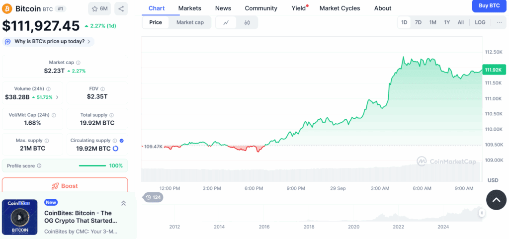 两小时前,比特币的价格徘徊在109,000美元,但领先的数字货币开始出现潜在的反弹。比特币代币目前交易价格为111,927.45美元。这是过去24小时内上涨了2.27%,过去30天上涨了3.1%。比特币的价格在一周内显著下降了2.4%,但最近的上涨大大弥补了周内的下跌。