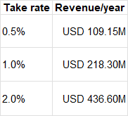 Web3 直接收益(费用模型):交易池 ≈ USD 21.83B,1% 抽成 = USD 218.3M/年收入 — 市场费用的现实目标。