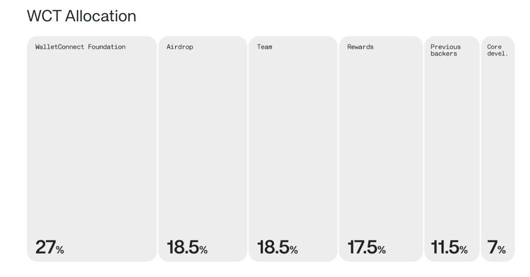 WalletConnect 基金会 (27%):分配用于生态系统的发展、伙伴关系、赠款和运营成本。
