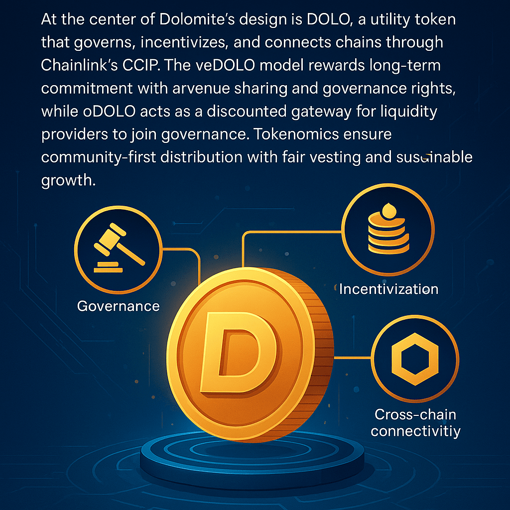 Dolomite 设计的核心是 DOLO,一种公用代币,通过 Chainlink 的 CCIP 进行治理、激励和链的连接。veDOLO 模型通过收益分享和治理权利奖励长期承诺,而 oDOLO 作为流动性提供者参与治理的折扣通道。代币经济学确保以社区为先的分配,并有公平的归属和可持续的增长。