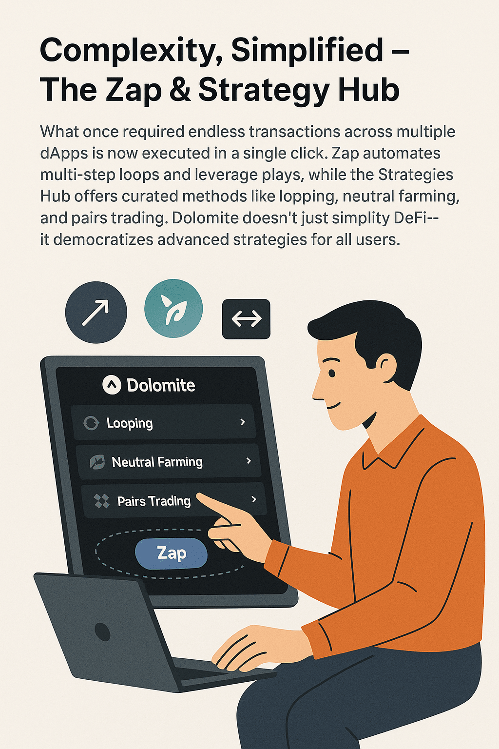 曾经需要在多个 dApp 之间进行无尽交易的过程,如今只需一次点击即可执行。Zap 自动化多步循环和杠杆操作,而策略中心提供循环、中性农业和配对交易等策划方法。Dolomite 不仅简化 DeFi—它还使所有用户都能够民主化高级策略。