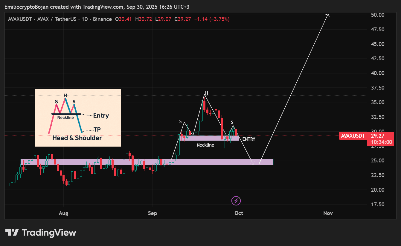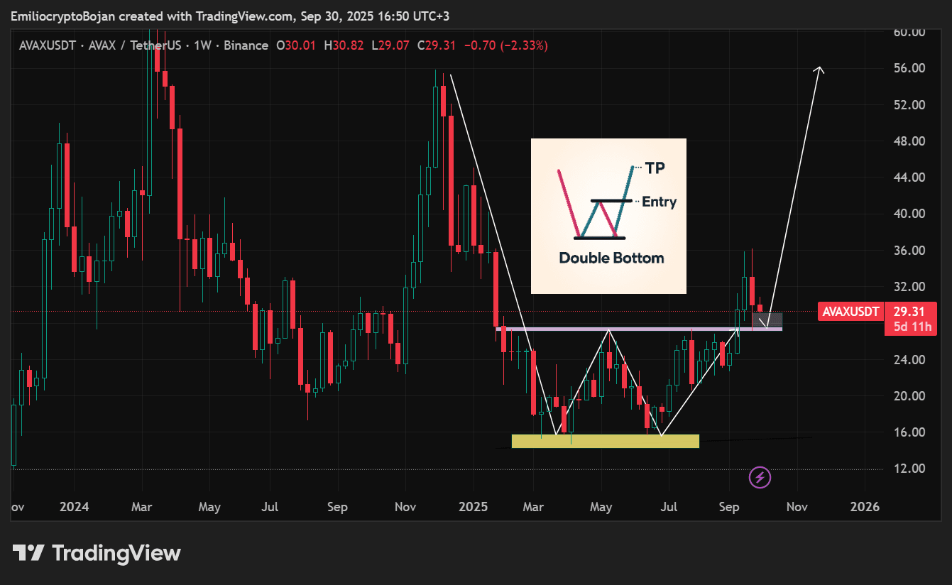 在周线图上,AVAX正在形成一个双底形态——这是技术分析中最强的看涨反转模式之一。这预示着积累。向27美元发射台的健康修正将为下一次重大反弹提供所需的动力。