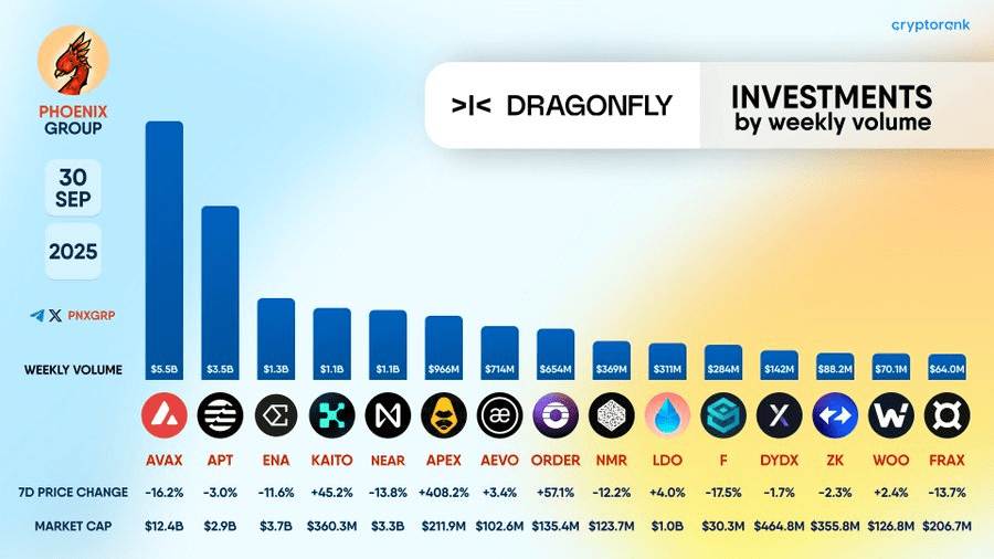 支持技术图景,$AVAX 在机构兴趣方面也处于领先地位。数据显示,AVAX在每周投资量中名列前茅,达到55亿美元,远远领先于其他主要资产,如APT(35亿美元)和ENA(13亿美元)。