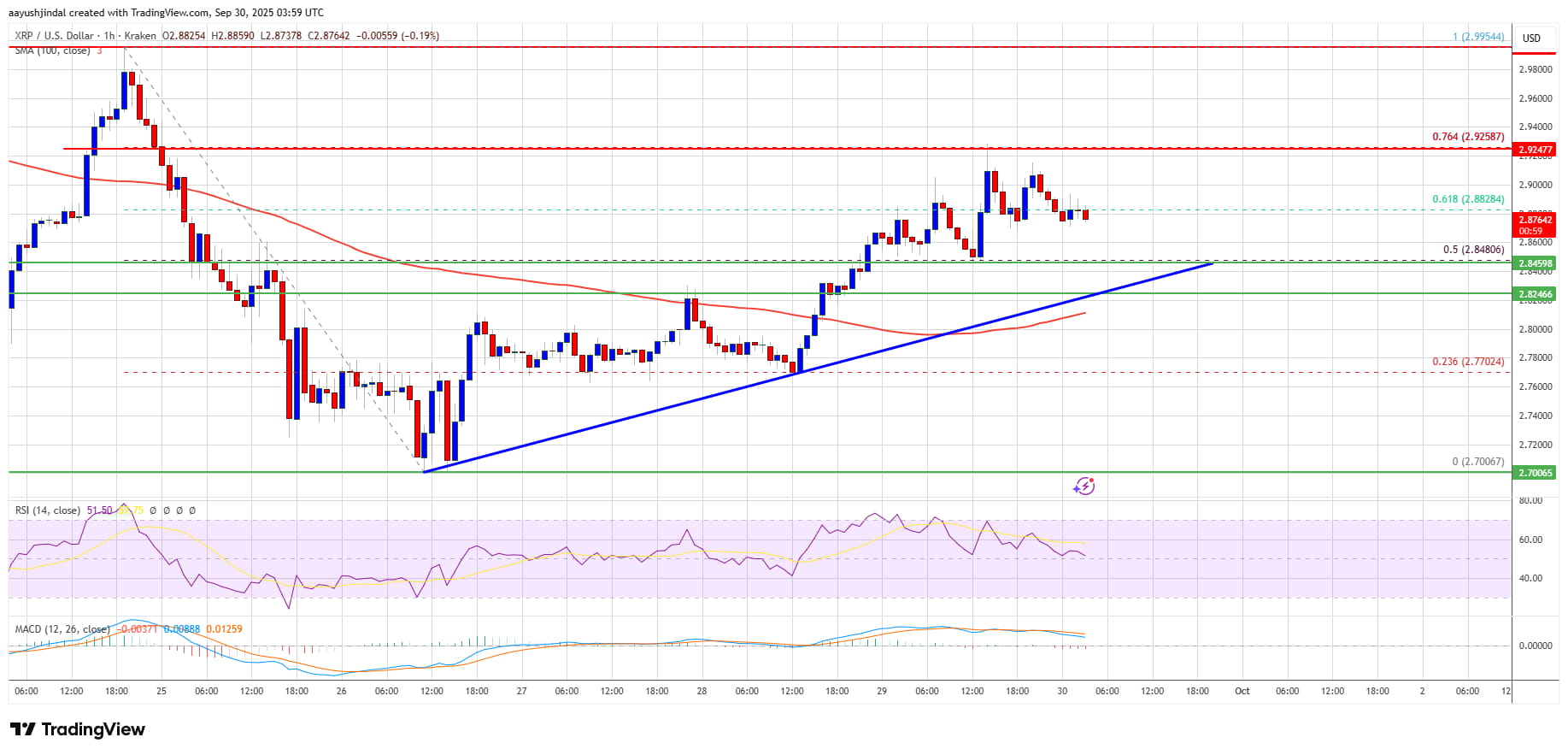 XRP价格正在缓慢上升,突破了$2.850的支撑区。