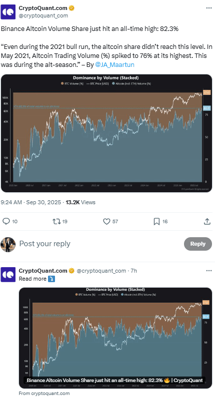 在币安上,山寨币的交易量飙升至历史新高,山寨币现在占交易所总交易活动的82.3%。这一里程碑超过了2021年山寨币季节期间76%的峰值,凸显出当前的山寨币季节正获得不可阻挡的动力。