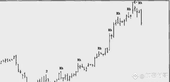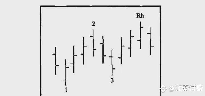 1、一个低位1-2-3结构被突破后,第一根没有出现更高高点的K线使Rh结构形成