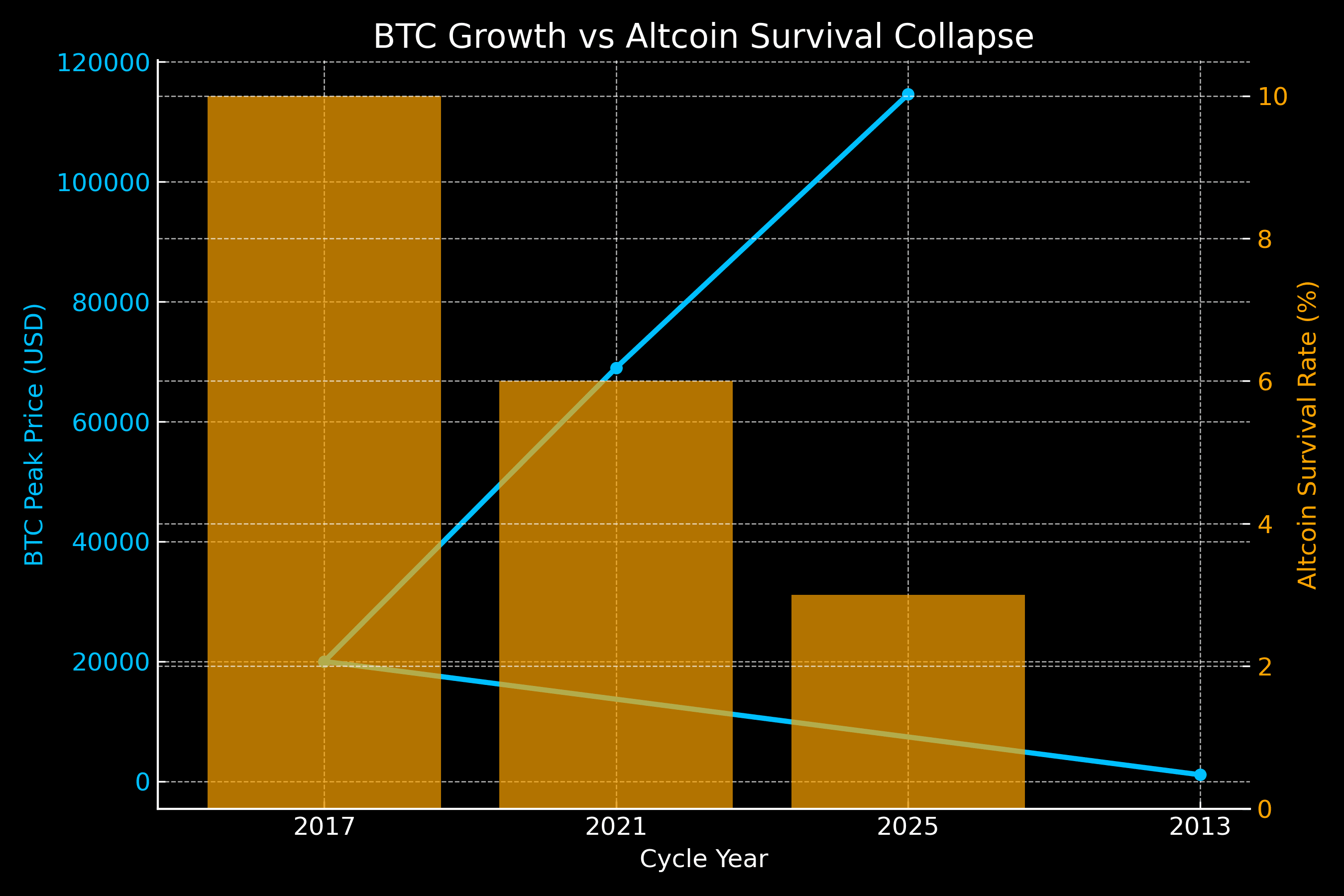 2017年的替代币中只有10%在2021年存活。到2025年,这个数字降到仅3%。每个周期都会抹去昨天的“蓝筹股”。叙事转变,流动性流向其他地方,散户则被遗留下来,手中持有被遗忘项目的袋子。