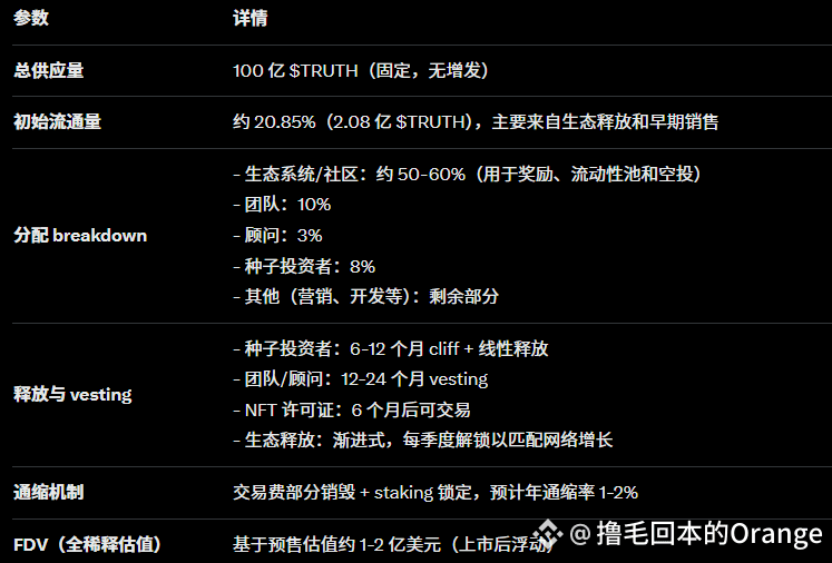 初始流通量为 2.08 亿 $TRUTH,占总供应量的 20.85%。这部分主要包括: