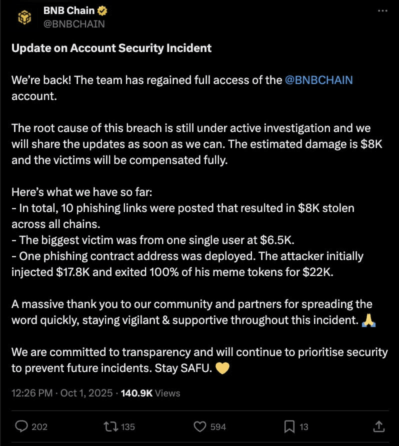 BNB Chain今天宣布,其官方X账户(@BNBCHAIN)已在最近的安全事件后完全恢复,该事件中攻击者获得了未经授权的访问权限并分享了多个网络钓鱼链接。