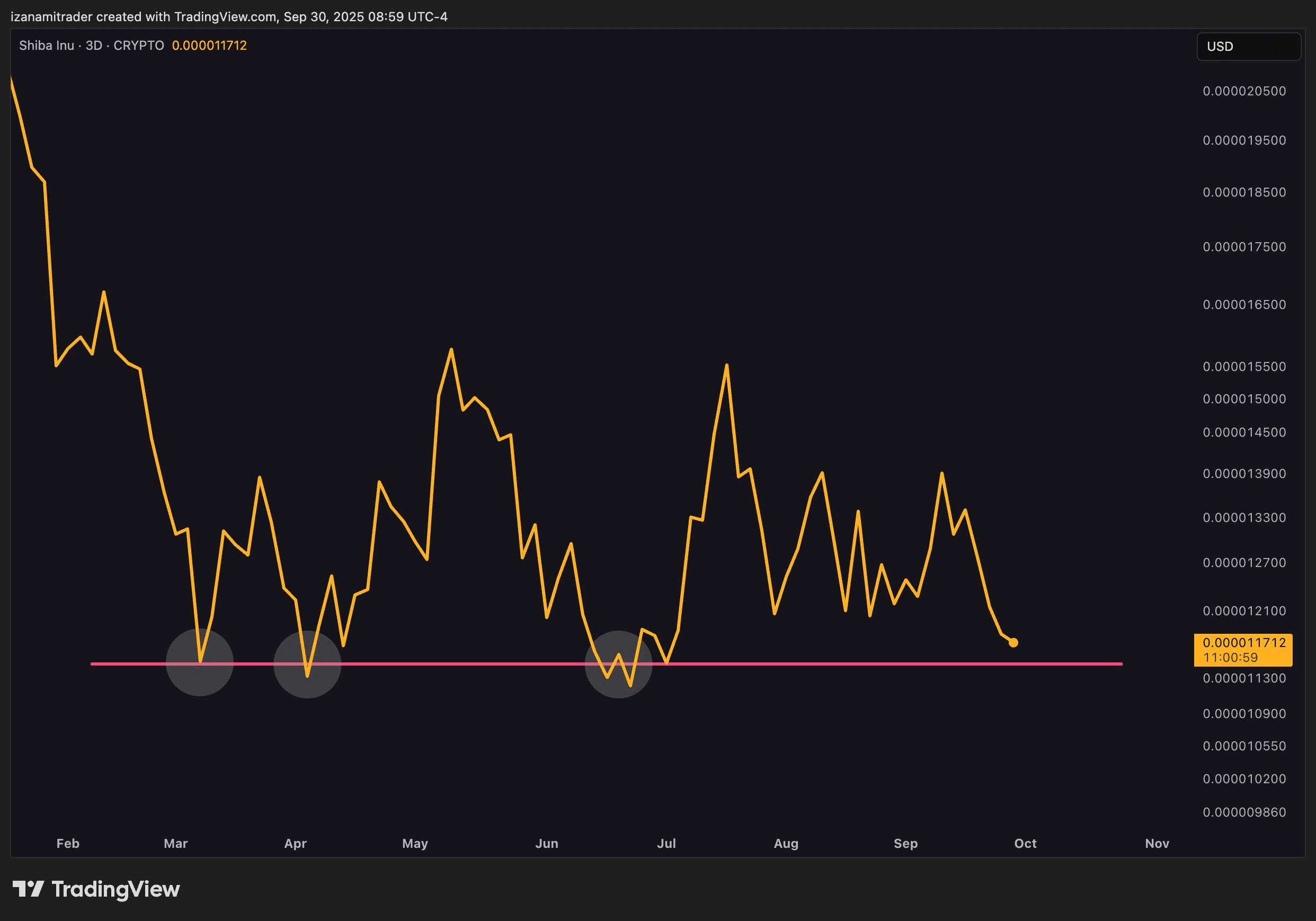 尽管Coinvo在他的分析中提到了一处“主要阻力”,但图表清楚地显示出$0.00001150作为支撑。这一区域一直是SHIB在2025年的转折点: