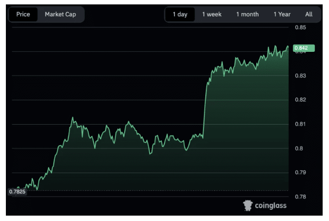 突破:价格飙升至$0.84,在一个交易时段内增长近8%——在一个一直横盘的市场中,这是一个显著的变化。