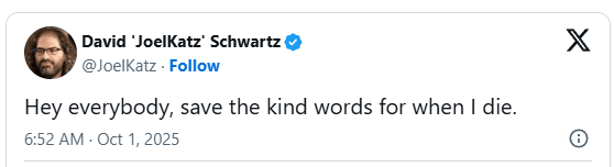 就在社区庆祝他的职业生涯之际,施瓦茨在X上发表了一条带有戏谑意味的评论,瞬间改变了语调。“嘿,大家,等我死了再说好话。”他这样写道。