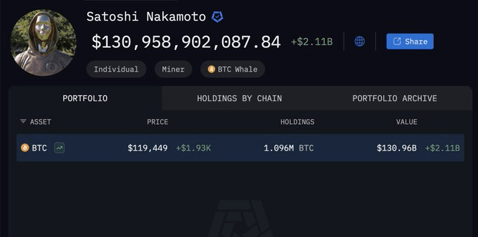 中本聪的比特币财富再次超过1300亿美元,传奇的1.096M $BTC 的储藏自早期以来未曾动过。以每枚119K美元的价格,这使他成为金融界最富有的幽灵,巩固了比特币作为终极价值储存的角色。