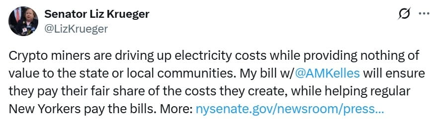纽约立法者已提交一项法案,对大型比特币挖矿农场使用的电力征税。参议员莉兹·克鲁格和议会成员安娜·凯勒斯提出法案 S8518,向矿工按千瓦时收费,并利用这笔钱帮助低收入家庭支付能源账单。该计划将纽约比特币挖矿税置于关于公平和能源政策的辩论中心。
