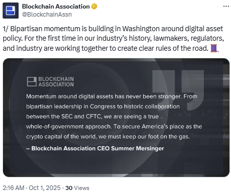 加密行业也发表了看法。区块链协会发出声明,呼吁两党合作,警告说,长期关闭可能会阻碍数字资产监管的进展。“加密货币的明确规则不应成为政治游戏的牺牲品,”该组织表示。