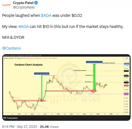 受欢迎的加密分析师 Crypto Patel 还强调,ADA 的图表现在显示出类似于 2020 年的突破模式——当时代币从 0.10 美元飙升至 3.00 美元。如果历史重演,他建议 ADA 可能瞄准高达 15 美元,代表从当前水平潜在的 1800% 增长。