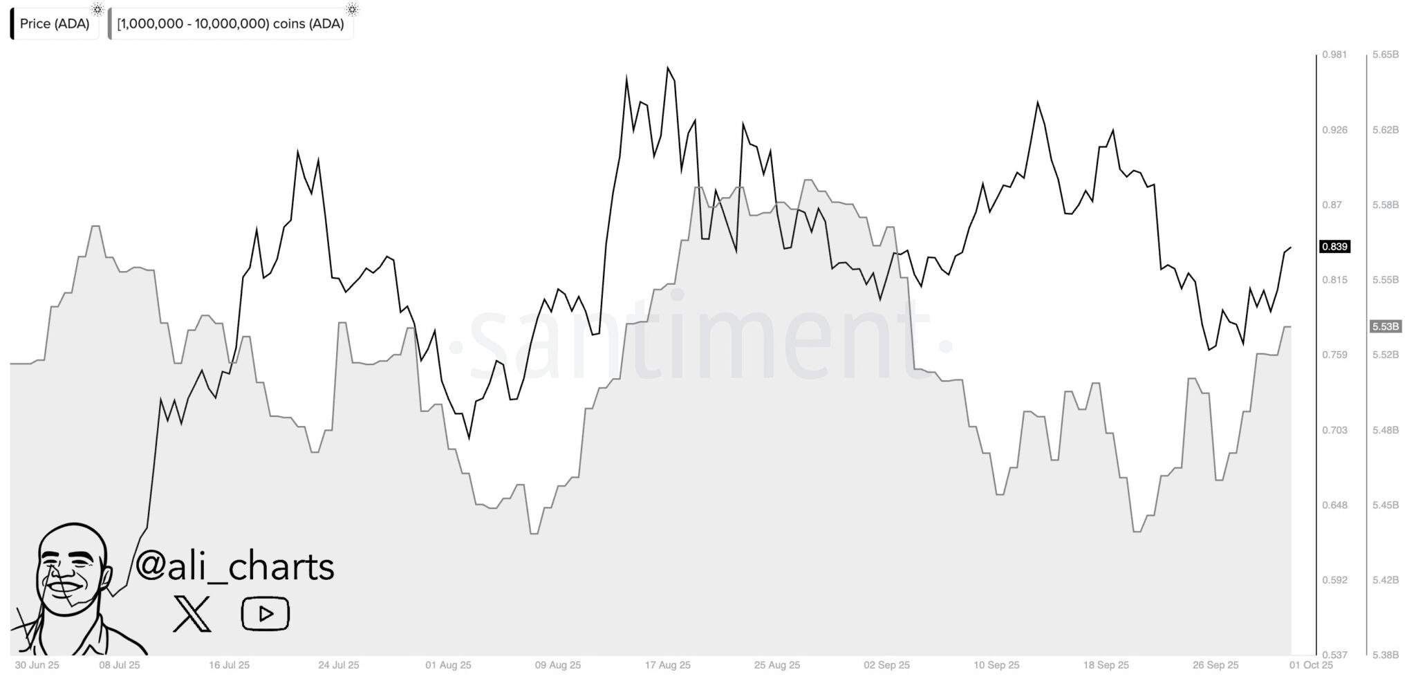 Cardano (ADA) 正在以两方面的动能开启十月。与 Brave Wallet 的集成为超过 1 亿用户解锁了对 ADA 的直接访问,而链上数据表明鲸鱼在短短一周内已经收购了超过 7000 万 ADA。