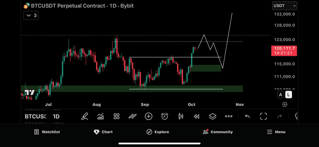 十月初短暂回调围绕$110,000–$118,000支撑(绿色水平线可能表示关键水平)。