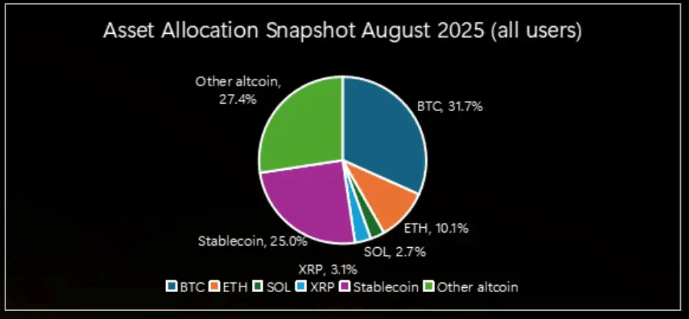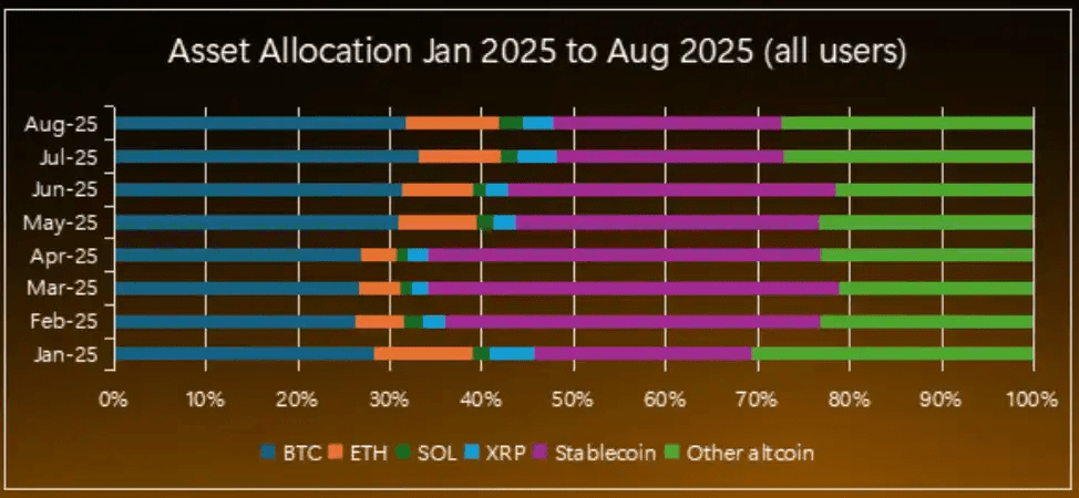 在本报告的数据期间,稳定币持有百分比从2025年4月的42.7%和2025年6月的35.42%急剧下降至2025年8月的仅25.0%。