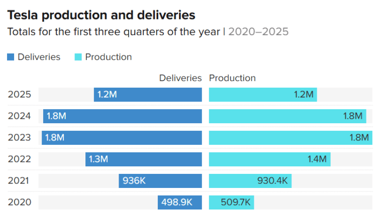 特斯拉在2025年上半年面临重大挑战。收入同比下降13%,汽车销售下降18%,营业利润暴跌52%,净收入下降38%。在欧洲,收入下降超过三分之一,瑞典、比利时和荷兰的降幅最大。特斯拉在电池电动车市场的份额从21.6%下降到14.5%。尽管公司报告第三季度交付了497,099辆汽车,比去年增加了7%,但与去年相比,生产实际上下降了。