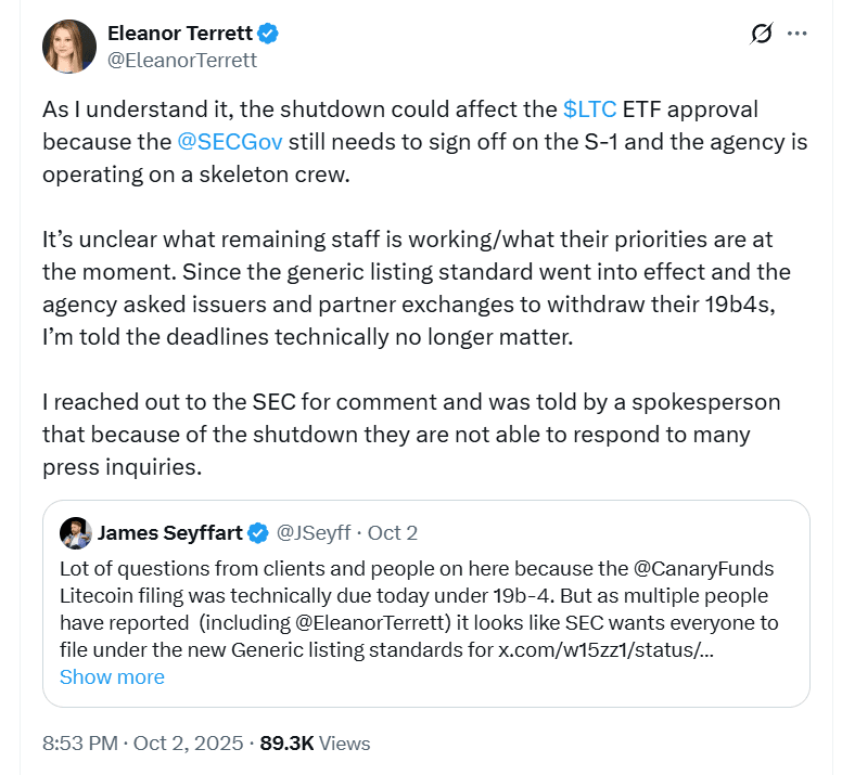 值得注意的是,SEC错过了Canary Capital提出的莱特币ETF的决定截止日期,该截止日期定于10月2日。因此,许多人推测,在停摆期间,其他加密货币ETF提案也将面临同样的命运,包括与XRP相关的提案。
