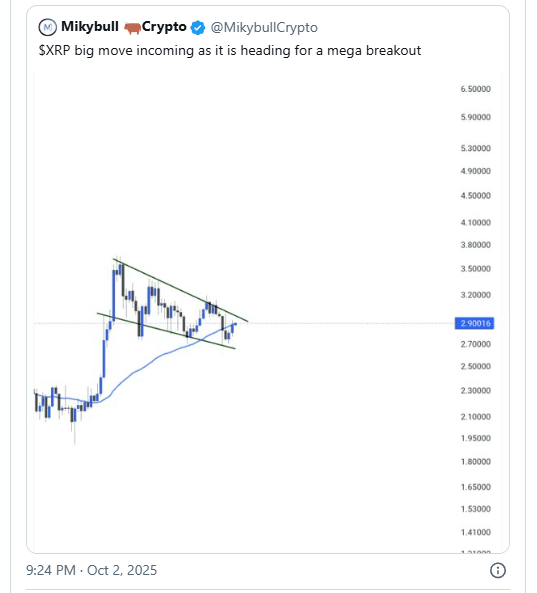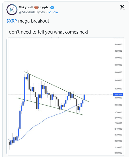 分析师Mikybull Crypto注意到XRP图表上的“超级突破”,强调了超越长期下降通道的决定性举动。TradingView的数据证实了这一突破,价格突破了上升趋势线,并稳固地保持在50日移动平均线附近。