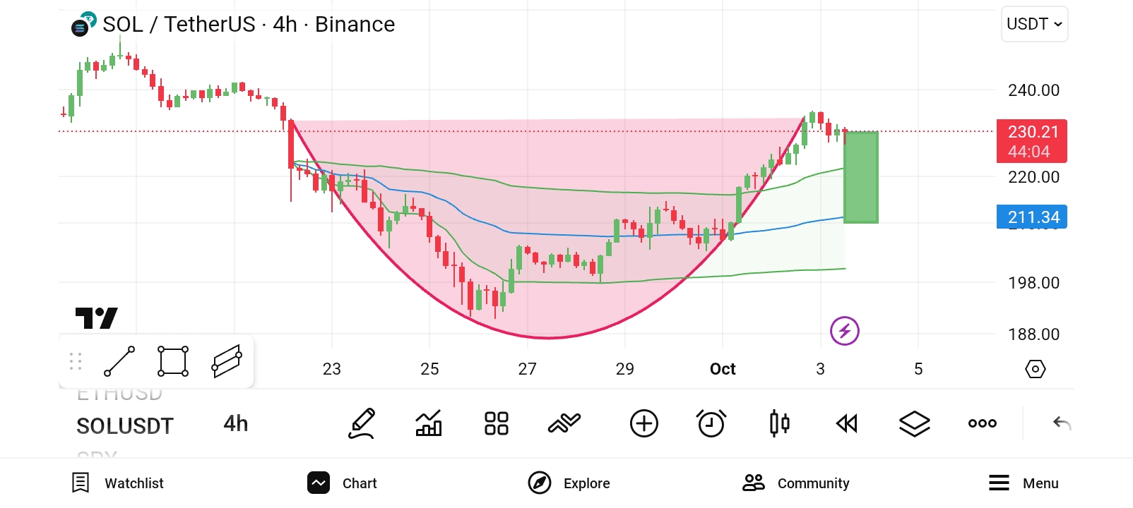 $SOL 看起来有熊市迹象 🐻,因为它完成了杯形图案的形成,现在是把手形结构的时间,我们得到了一个熊市的日线收盘⚠️。