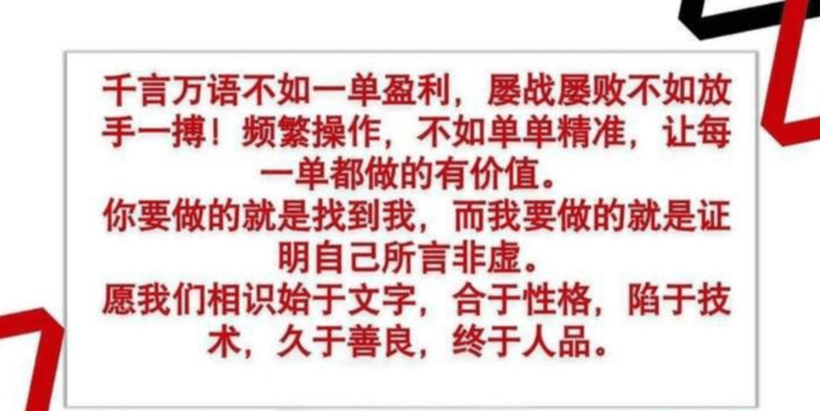 因为每个人对方向的判断,开仓平仓的点位,仓位的比例,以及使用的指标、周期都是不同的,都有自己的标准,一旦进行讨论,你人性中的不安全感就会被激发,开始怀疑自己的交易策略,最终在交易当中就会患得患失,造成损失。