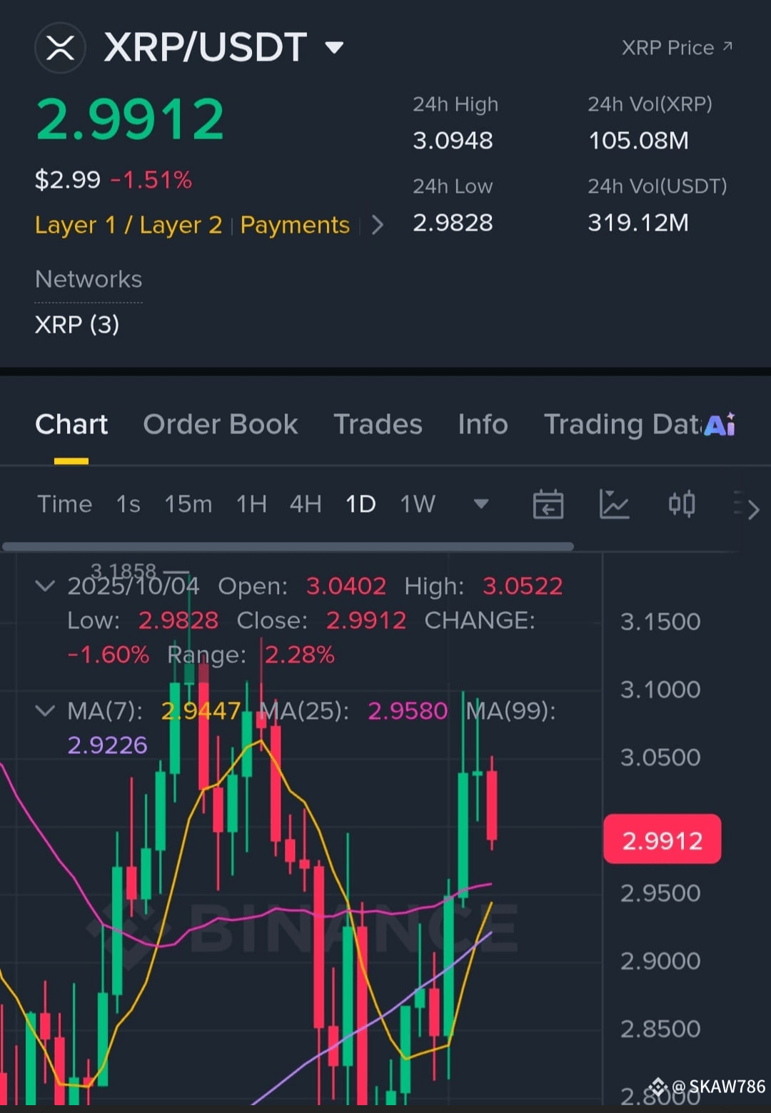 目前正在经历短期下跌——在强劲上升趋势中的经典回撤。随着7日和25日移动平均线(MA7: $2.9447, MA25: $2.9580)坚挺,牛市结构保持完好,暗示从$2.98支撑位可能反弹。