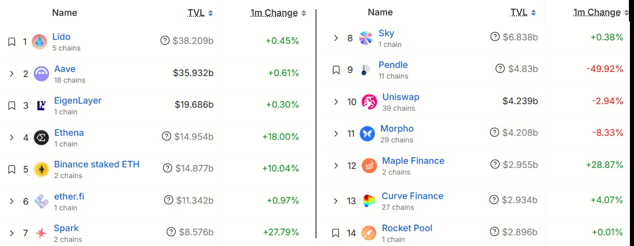 在以太坊的TVL增长中,合成稳定币协议Ethena在过去30天内增长了18%,而专注于借贷和稳定币收益的DeFi平台Spark的存款增长了28%。另一方面,Pendle收益平台的TVL下降了50%,而借贷平台Morpho的存款下降了8%。