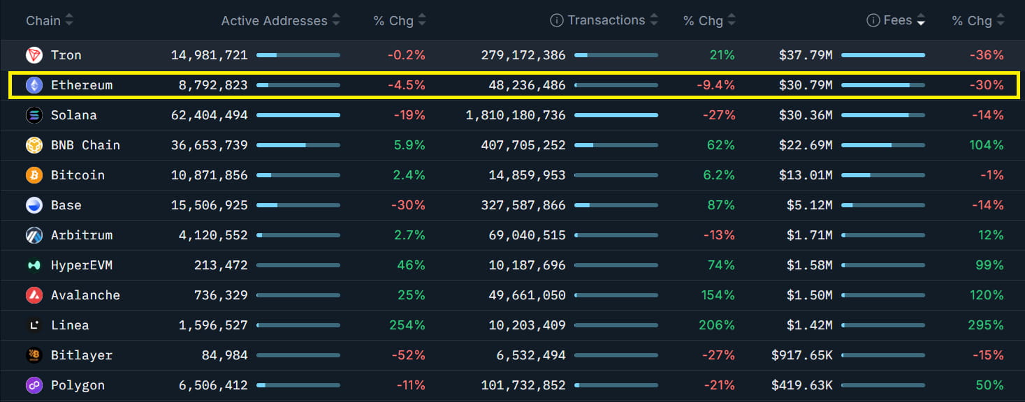 根据Nansen,以太坊的网络费用在过去一个月下降了30%,而交易量下降了10%。相比之下,BNB链、Avalanche和HyperEVM的费用翻倍,交易数量在同一时期激增了60%或更多。尽管以太坊智能合约的存款在一个月内增长了5%,交易员仍担心竞争对手正在稳步缩小差距。