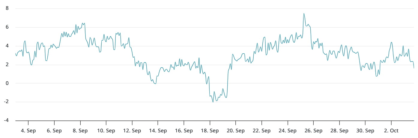 ETH月期货的交易价格较现货市场溢价7%,处于5%到10%的中性范围内,能够补偿较长的结算周期。值得注意的是,自二月以来,该指标未曾转为看涨。即使在8月13日之前的六周内,ETH的100%反弹也不足以激发信心。