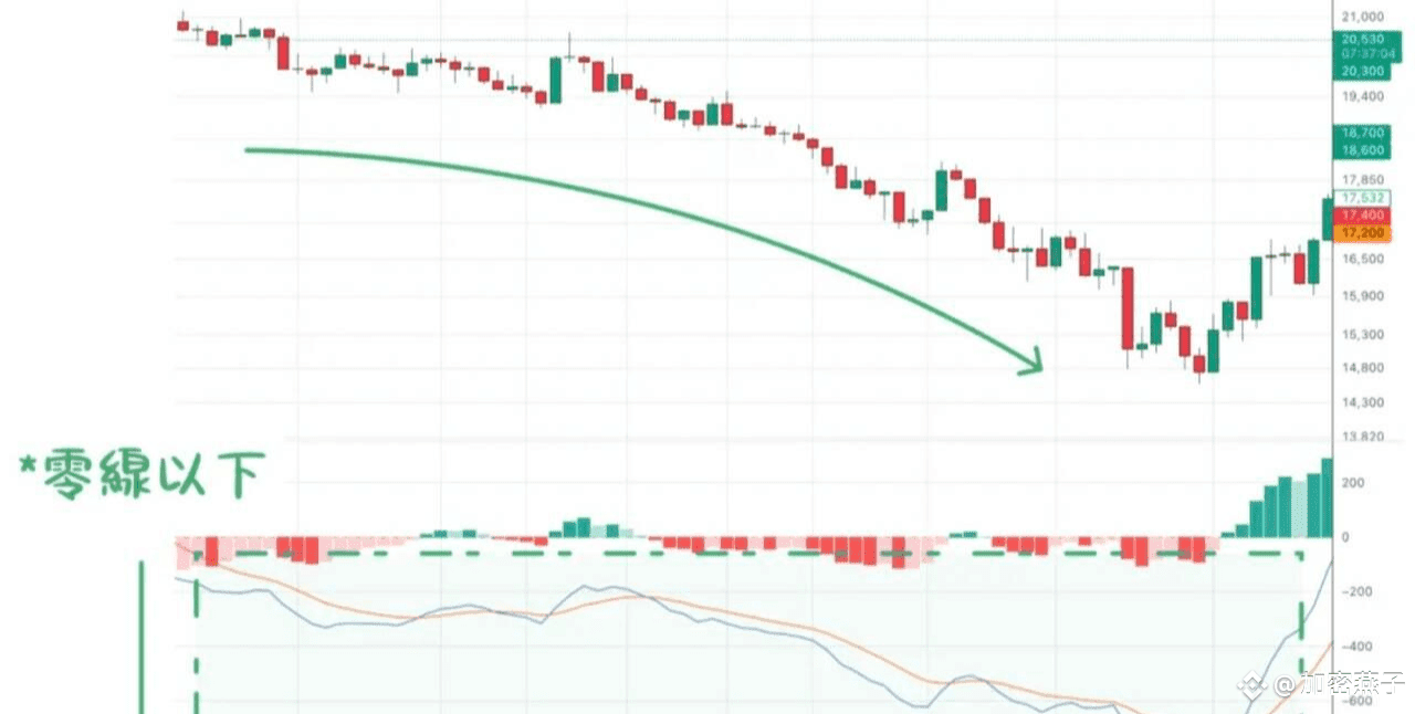 跌势:当快线与慢线都处于零线下方,那产品一般处于跌势当中。