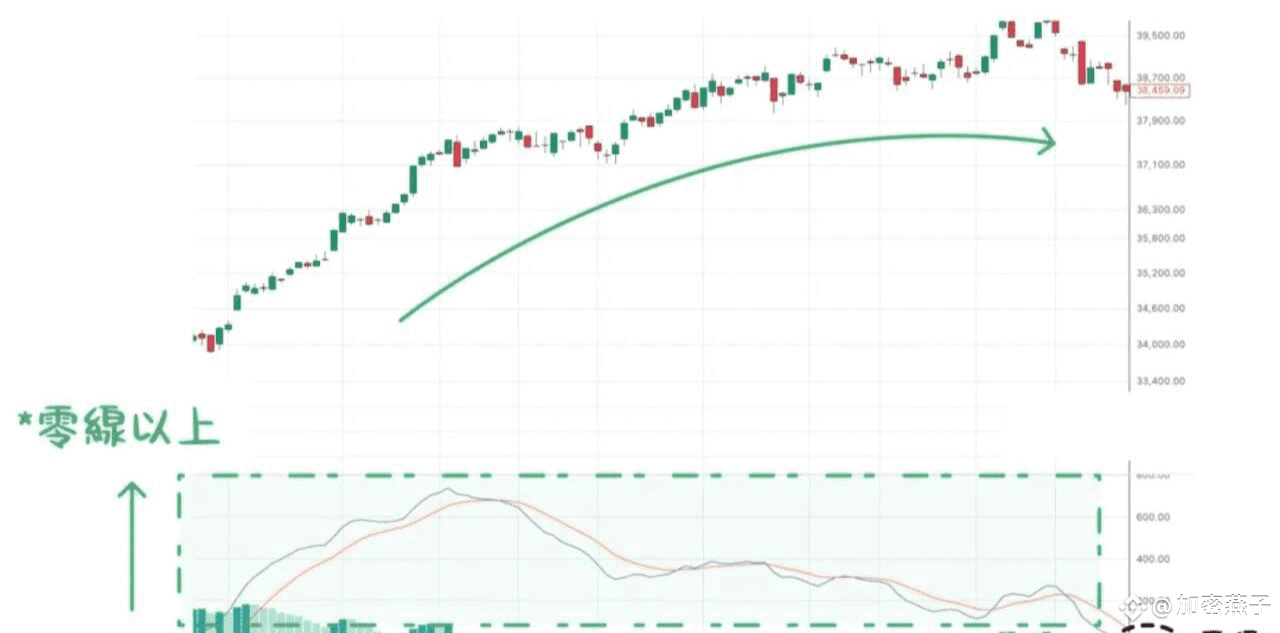 升势:当快线与慢线都处于零线上方,那该产品一般都在升势当中。