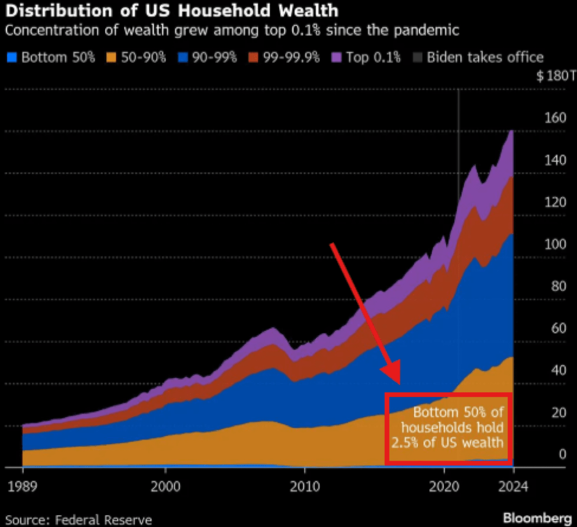 美国底层50%的家庭现在仅占美国总财富的2.5%。