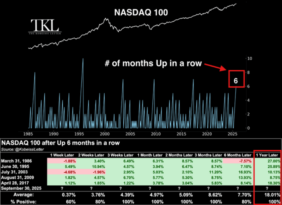 纳斯达克100指数连续6个月上涨,这自1986年以来只发生过6次。