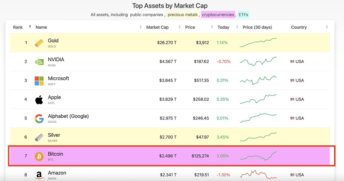 黄金、白银和比特币现在都是世界上最大的十种资产之一。