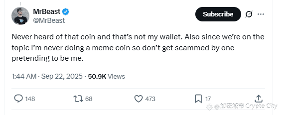 直到 2025 年 9 月份,隨著 MrBeast 的錢包地址再次買進市場熱門的 ASTER 代幣,截至 10 月 1 日,MrBeast 共花費 168 萬美元買了 95 萬枚 ASTER。此舉再次引發了社群關於他即將「喊單」的猜測。但這一次,MrBeast 的反應出乎所有人的意料。面對社群的討論,他公開發表聲明,直接否認了這筆投資,稱他「從未聽說過這個幣」,並且「那不是他的錢包」。
