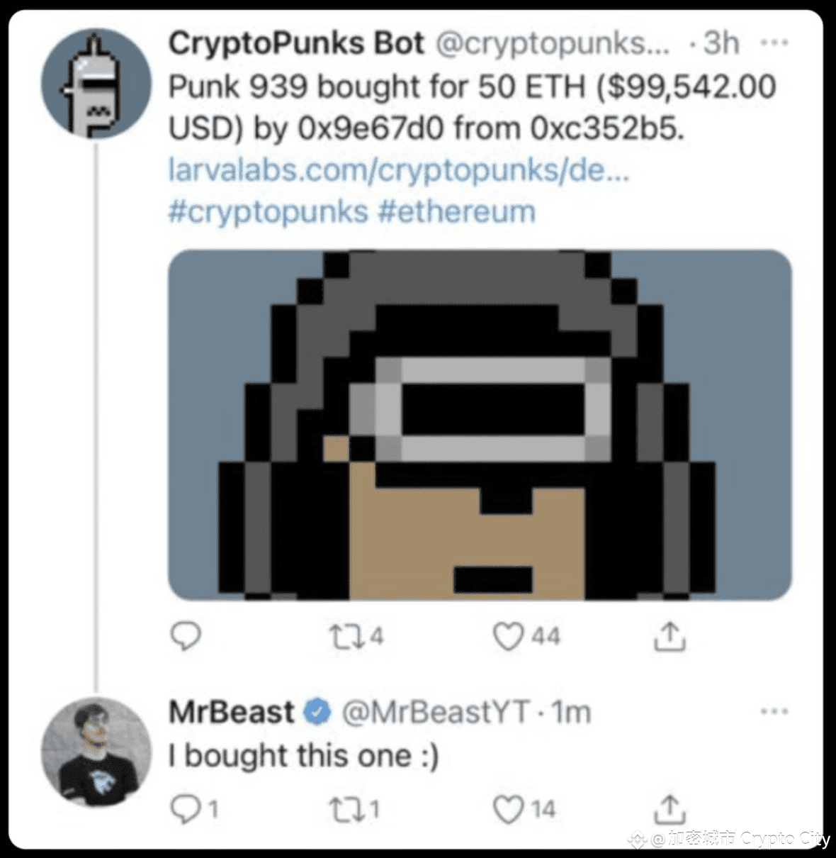 2021 年 2 月,MrBeast 高調宣布購買了八枚 CryptoPunks NFT,結合之前的買入,他一共買進了十幾枚 CryptoPunks NFT。加上市場上同期有大量體育娛樂明星的追捧,CryptoPunks 地板價極速飆升。到 8 月,MrBeast 開始拋售一部分 NFT,最高的 CryptoPunk #7200 售出 120 ETH,換算為當時價格約為 38.95 萬美元,相比最初的 2166 美元成本,這一個 NFT 就給他帶來了超過 38 萬美元的收益,上漲幅度超過 178 倍。