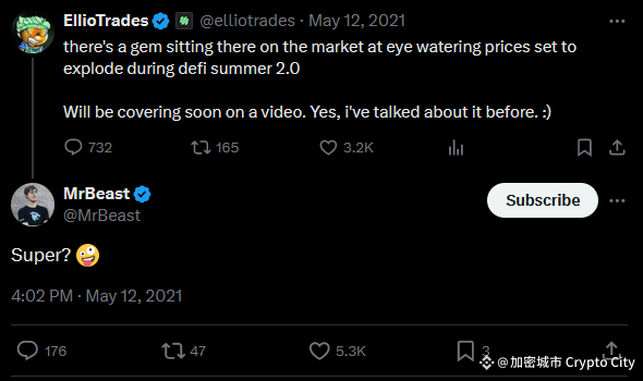 在代幣公開發行後,MrBeast 開始利用其巨大的社群媒體影響力進行「推廣」。2021 年 5 月 12 日,在項目創辦人發布了一條關於市場機會的推文後,MrBeast 在下方回覆了一個詞:「super?」。這條看似不經意的互動,對於他數千萬的粉絲來說,無異於一個強烈的看漲訊號。