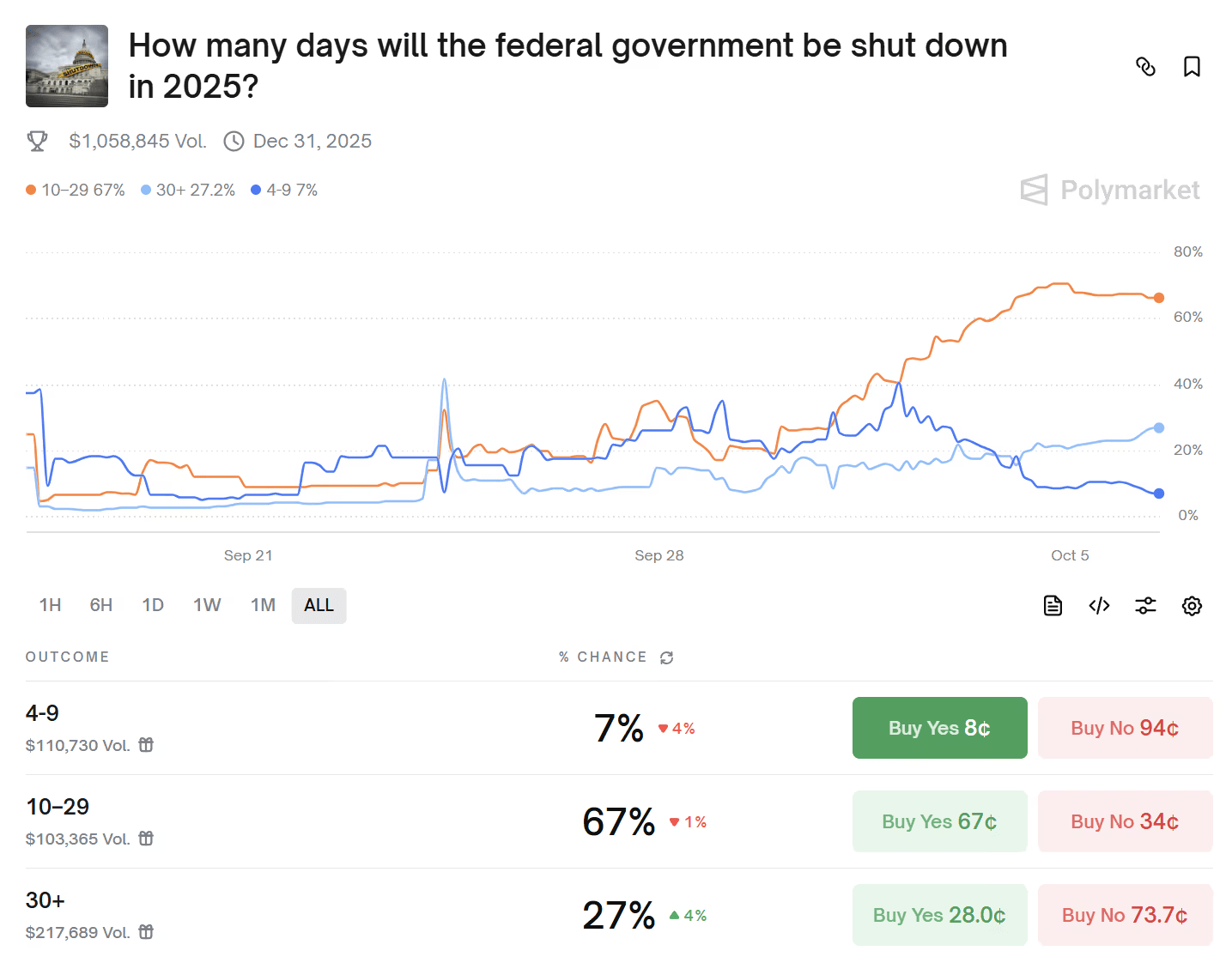 另一个活跃的合约显示67%的下注者预计停摆将持续10到29天,而只有27%预测它将延续超过一个月——这清楚地表明交易者相信妥协将在不久后达成。