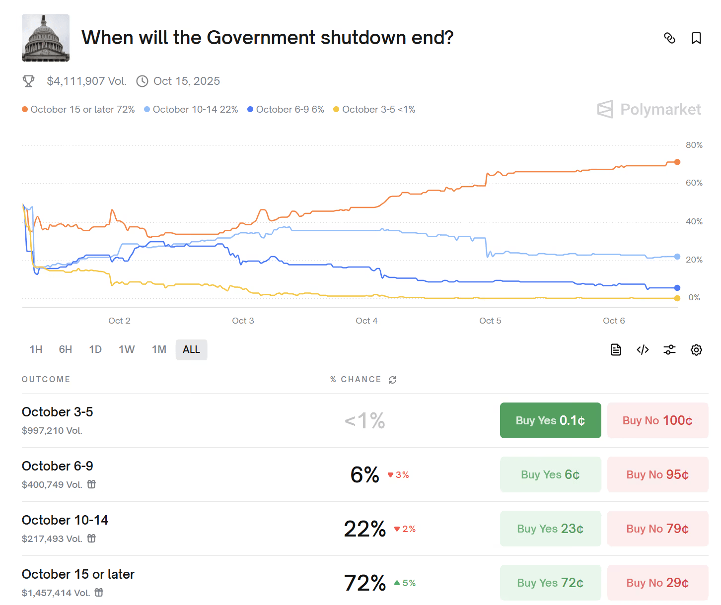 根据Polymarket的数据,市场询问“美国政府何时重新开放?”的总交易量已接近400万美元,超过140万美元被押注在政府在10月15日之后重新开放的情景上。