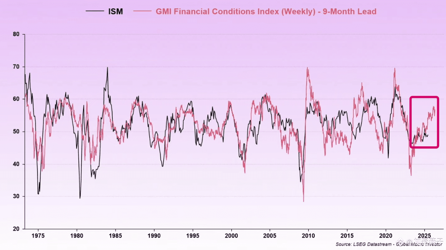 如果我们再把目光投向美国ISM制造业指数,会发现它还远未触顶。与此同时,全球宏观投资者GMI发布的金融状况指数,也在试图领先于ISM的走势——两者目前都处于上升通道。按理说,这种“先抑后扬”的走势,应该为资产价格提供一次强有力的推升。再加上那份期待已久的刺激法案正在酝酿落地,中东也在对美国的人工智能、半导体等前沿领域加大投资力度,一场浩大的资金进场潮几乎不可避免。