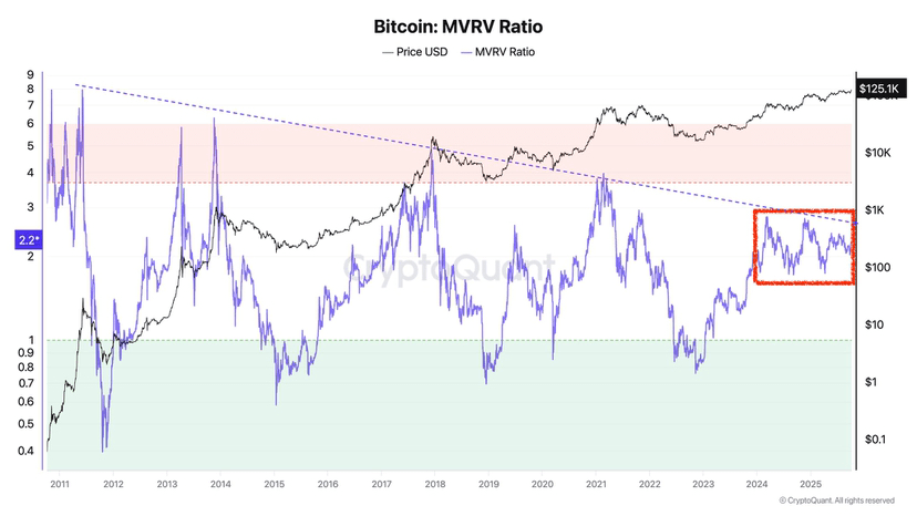 这个模型将比特币的市场价值与其实现价值进行比较。