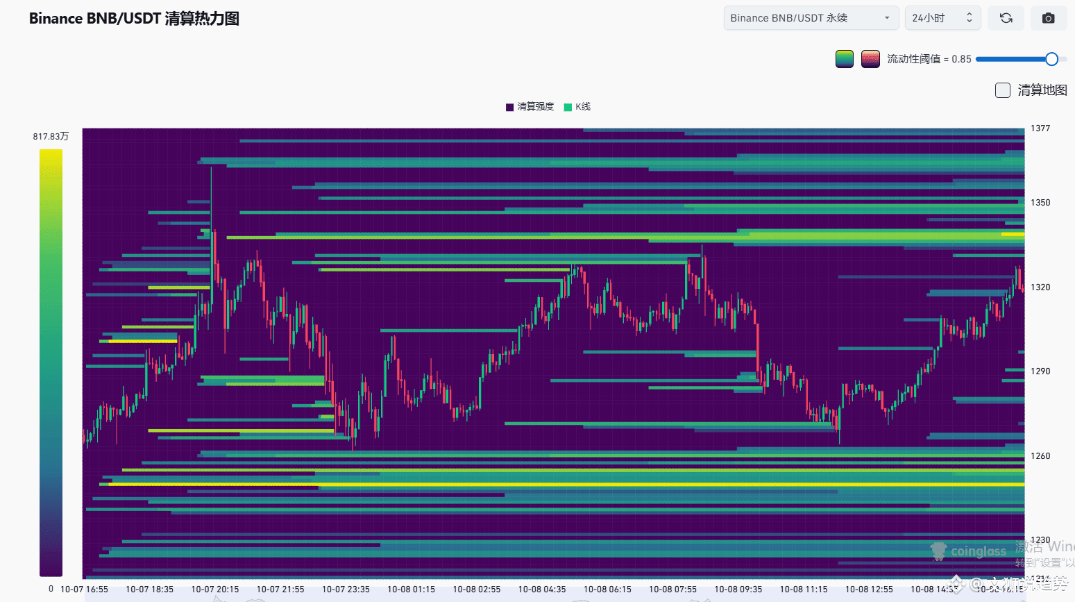 从清算热力图来看,BNB在1320-1376区间密集堆积了大量清算单,尤其是1320附近多次出现“底部成交”支撑,说明主力在此护盘意图明显。