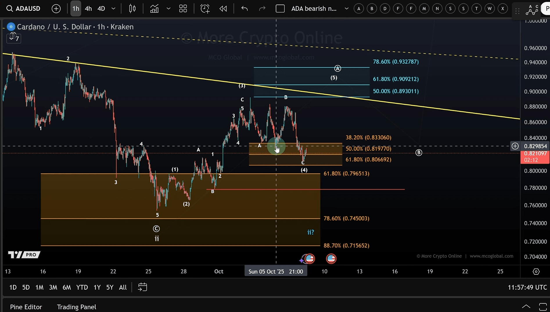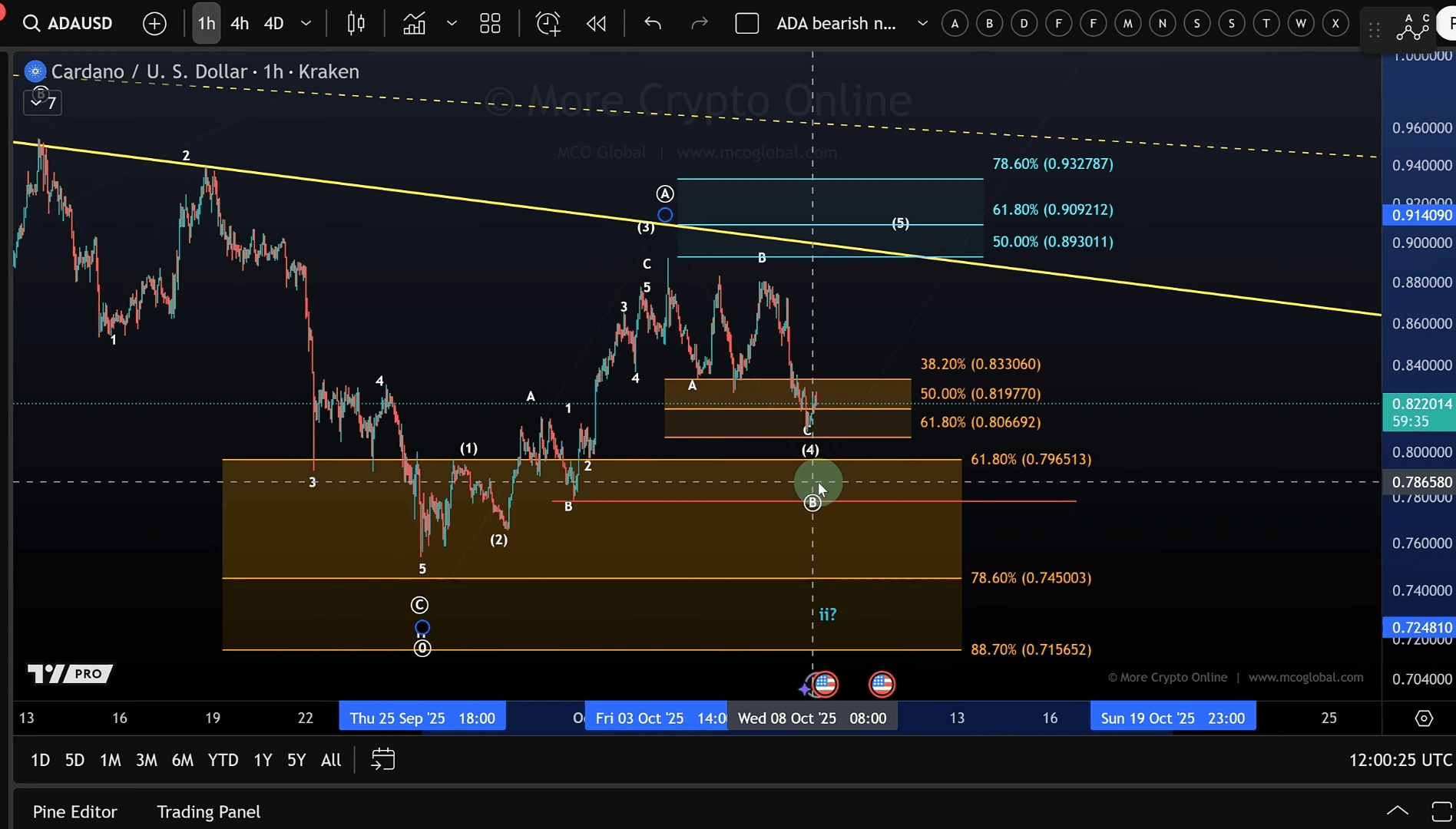 从最近的高点下跌看起来是修正性的,形成了一个干净的 ABC(三波)结构,进入了 $0.806 和 $0.833 之间的关键支撑区域。