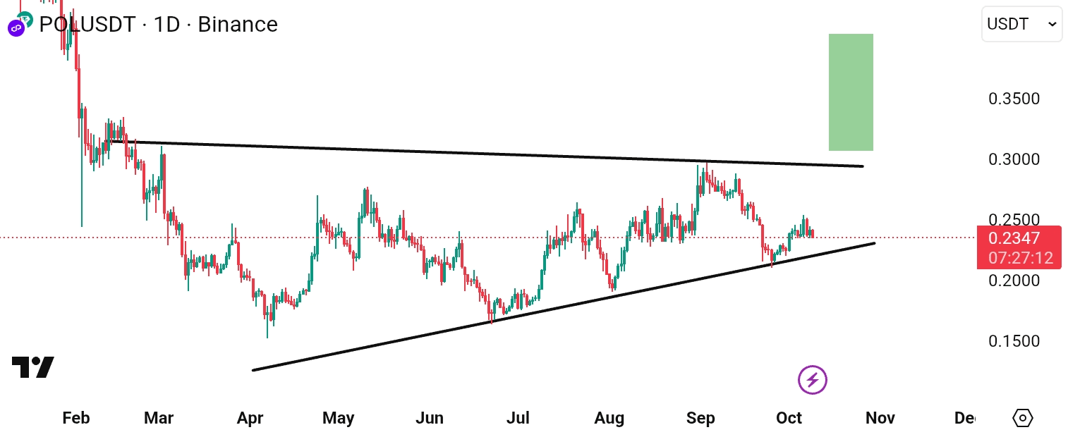 $POL 正紧密盘整在一个对称三角形形态内,预示着市场的剧烈压缩和即将到来的爆发性走势 ⚡️📊。
