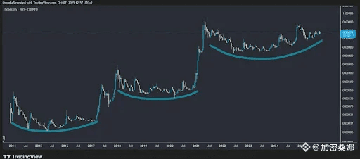 有个叫 Osemka 的分析师,翻遍了 DOGE 的历史 K 线,发现个规律:这货每次要爆之前,都会先整个 “圆底”—— 简单说就是价格先跌不动,然后慢慢往上翘,像个吃饭的碗底似的。