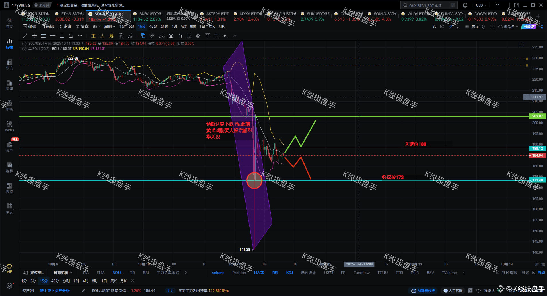 昨夜的加密市场堪称灾难现场,纳斯达克指数率先跳水,直接把 SOL 拽进了暴跌漩涡!更要命的是,特朗普突然放出要大幅加征对华关税的狠言,这颗炸弹一扔,SOL 价格瞬间从 184 刀直线砸穿到 168 刀,屏幕前的散户们瞬间慌了神,有的手忙脚乱割肉离场,有的盯着亏损数字欲哭无泪。