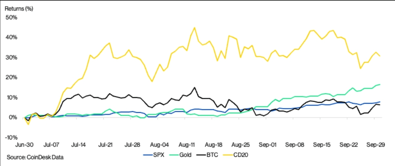 在指数表现中,广泛的趋势也很明显。CoinDesk 20指数跟踪20种流动性和可交易数字资产,在第三季度上涨超过30%,超越比特币。CoinDesk 80和CoinDesk 100捕捉中小型资产,同样也发布了强劲的回报,反映出市场资本范围内日益增长的兴趣。